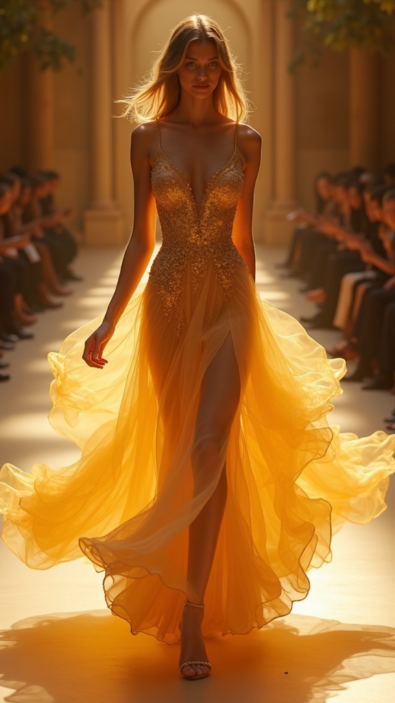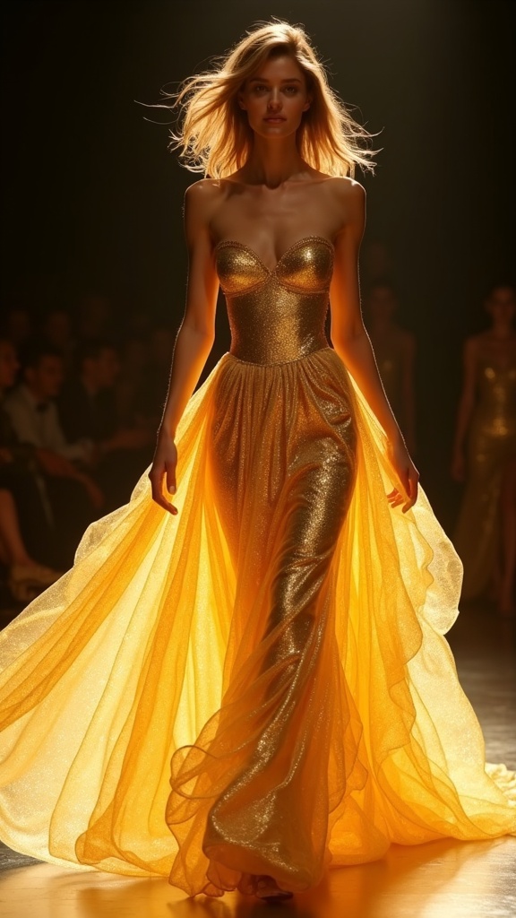 Cinematic Vogue magazine editorial, slow motion, luxury fashion, ethereal lighting, high detail, 8K resolution, fluid dynamics, magical realism. Wide shot, low angle. The model begins her walk at the top of the runway. Her gown is a cascade of shimmering, liquid gold that ripples and flows with each step, creating slow-motion waves of light. The fabric clings and billows simultaneously, defying gravity.. --ar 9:16
