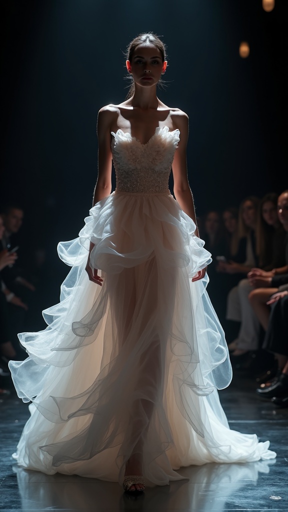 "A high-fashion runway show where a model's gown transforms from liquid gold to blooming peonies, and her makeup shifts like the Northern Lights, all captured in ethereal slow motion."