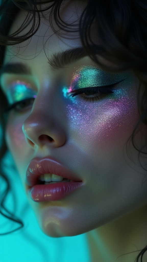 Cinematic Vogue magazine editorial, slow motion, luxury fashion, ethereal lighting, high detail, 8K resolution, fluid dynamics, magical realism. Extreme close-up on the model's serene face as she completes her spin. Her eyes are softly closed. The eyeshadow on her lids is alive, with colors of emerald green, violet, and magenta shifting and swirling in slow, fluid patterns like the Aurora Borealis.. --ar 9:16