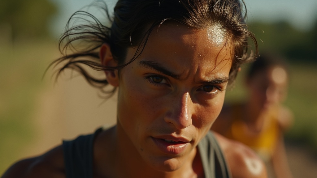 Grainy 16mm film stock, handheld camera work, natural lighting with high contrast, subtle color grading with muted tones, occasional film burn and gate weave artifacts. undefined wearing undefined. A close-up on the runner's face, sweat dripping from their brow, eyes fixed ahead with intense focus. The background is a blur of motion and grit.. , Natural late afternoon sun casting harsh shadows, high contrast with deep blacks --ar 16:9