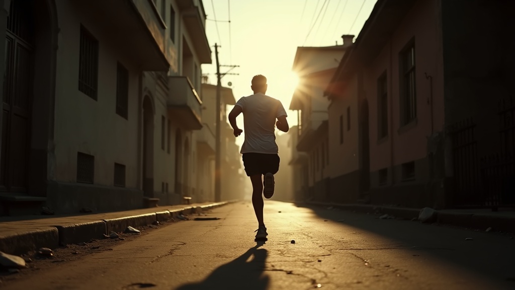 Grainy 16mm film stock, handheld camera work, natural lighting with high contrast, subtle color grading with muted tones, occasional film burn and gate weave artifacts. undefined wearing undefined. Low-angle shot of the runner's legs in motion, muscles straining, feet hitting the ground with force, kicking up small particles of dust.. , Side-lit by the sun, creating strong highlights and shadows on the legs --ar 16:9