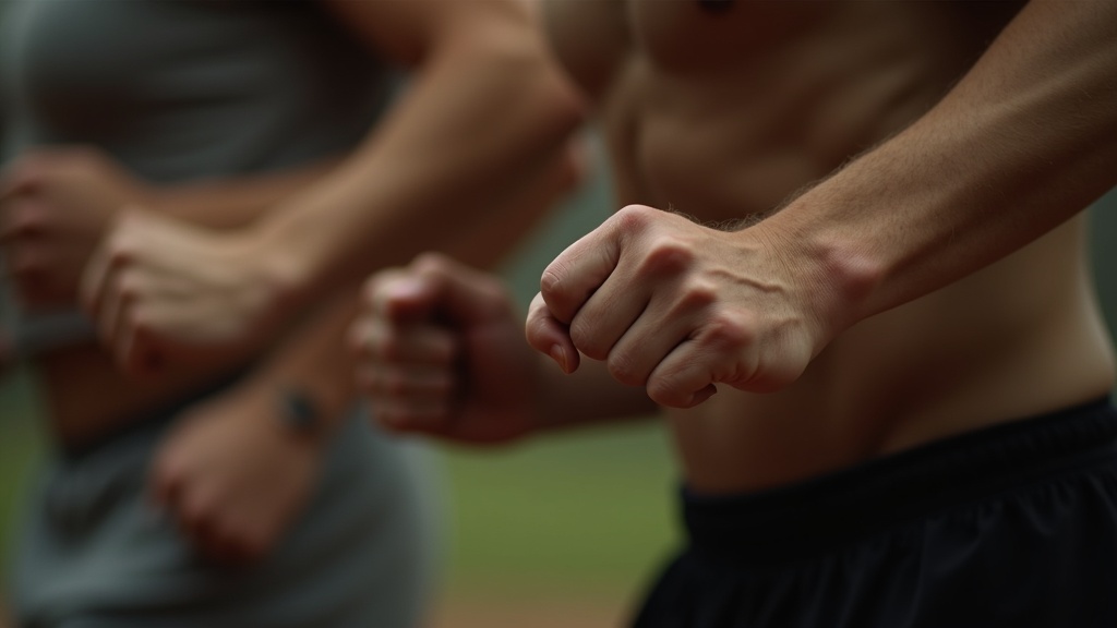 Grainy 16mm film stock, handheld camera work, natural lighting with high contrast, subtle color grading with muted tones, occasional film burn and gate weave artifacts. Extreme close-up on the runner's clenched fists, knuckles white with effort, as they pump arms in rhythm with their stride.. undefined --ar 16:9