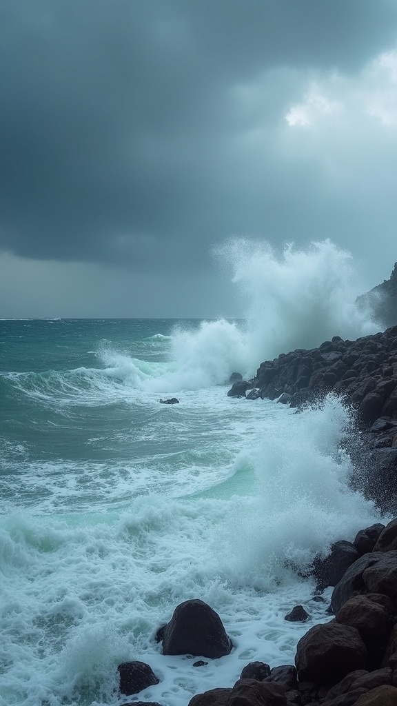 undefined. Wide shot of a turbulent sea with high waves crashing against a rocky shore. Dark storm clouds loom overhead, and sea spray is whipped violently by the wind.. , Low-key, naturalistic with overcast and moody tones, highlights on the white foam of waves. --ar 9:16