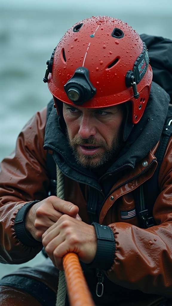 Close-up on a rescue team member in waterproof gear, struggling against the wind as they secure a rope. Water droplets cover the lens briefly.. Handheld, slight shake to emphasize the harsh conditions, tight focus on the rescuer's determined expression. --ar 9:16