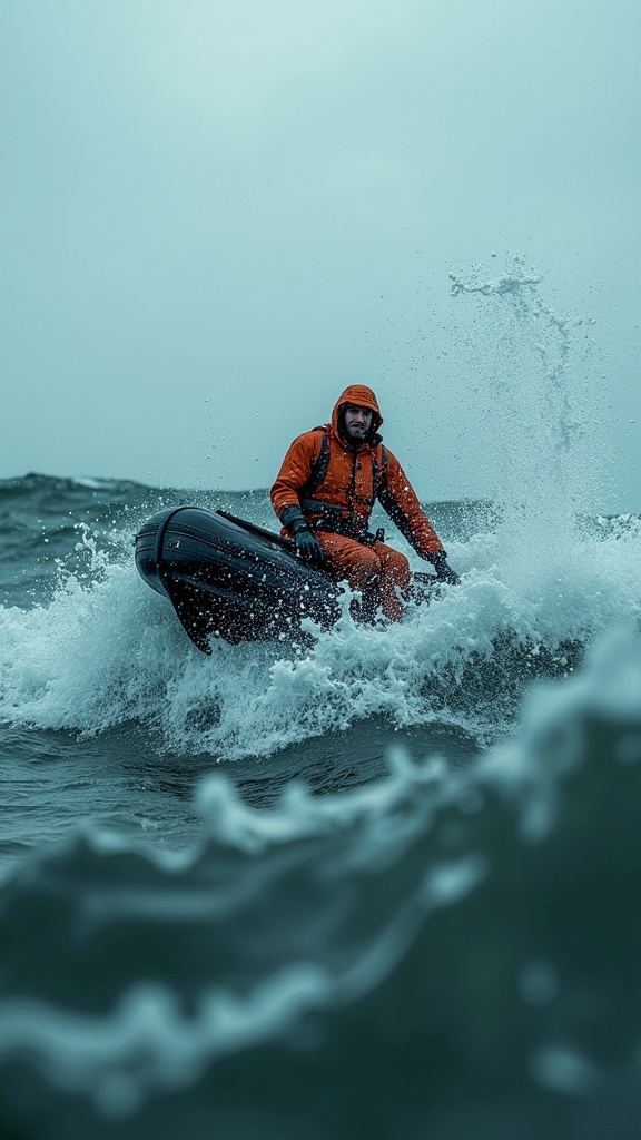 undefined. Medium shot of the rescue in action: a person is being pulled from the churning water onto a small boat, waves rocking it violently. Sea spray obscures parts of the frame.. , Gritty and realistic, with splashes of light from the overcast sky highlighting the struggle. --ar 9:16